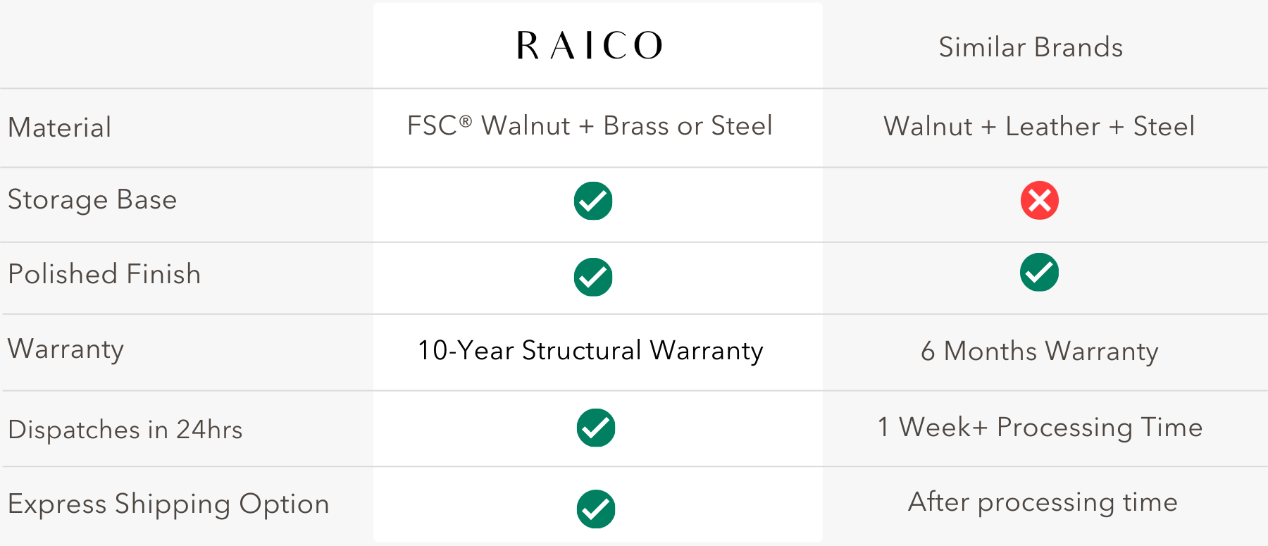 You've probably noticed that we have a carefully curated selection of raw materials. We believe these are the best materials out there for everyday use. Walnut and oak have a naturally beautiful grain and both of them have proven to be strong and durable hardwoods, ensuring that our pieces will last a long time.