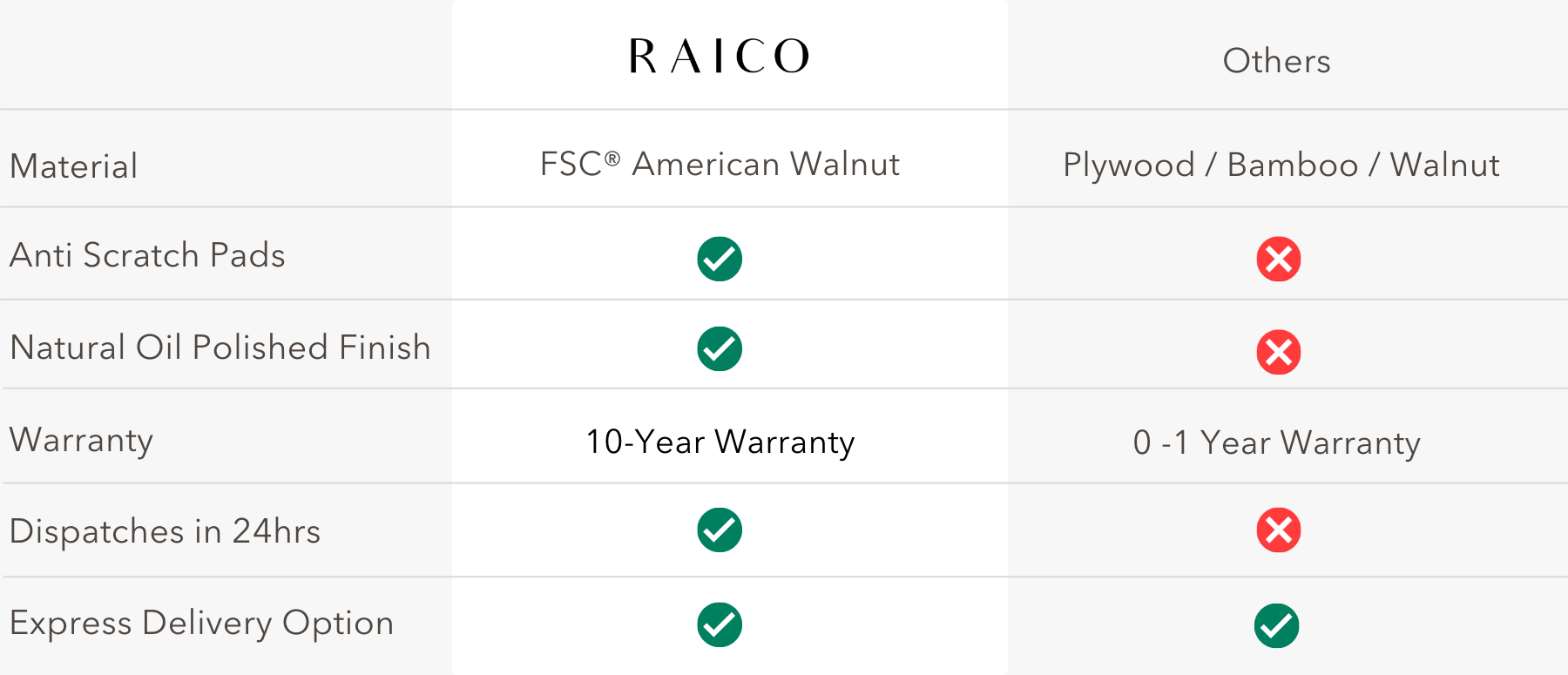 You've probably noticed that we have a carefully curated selection of raw materials. We believe these are the best materials out there for everyday use. Walnut and oak have a naturally beautiful grain and both of them have proven to be strong and durable hardwoods, ensuring that our pieces will last a long time.